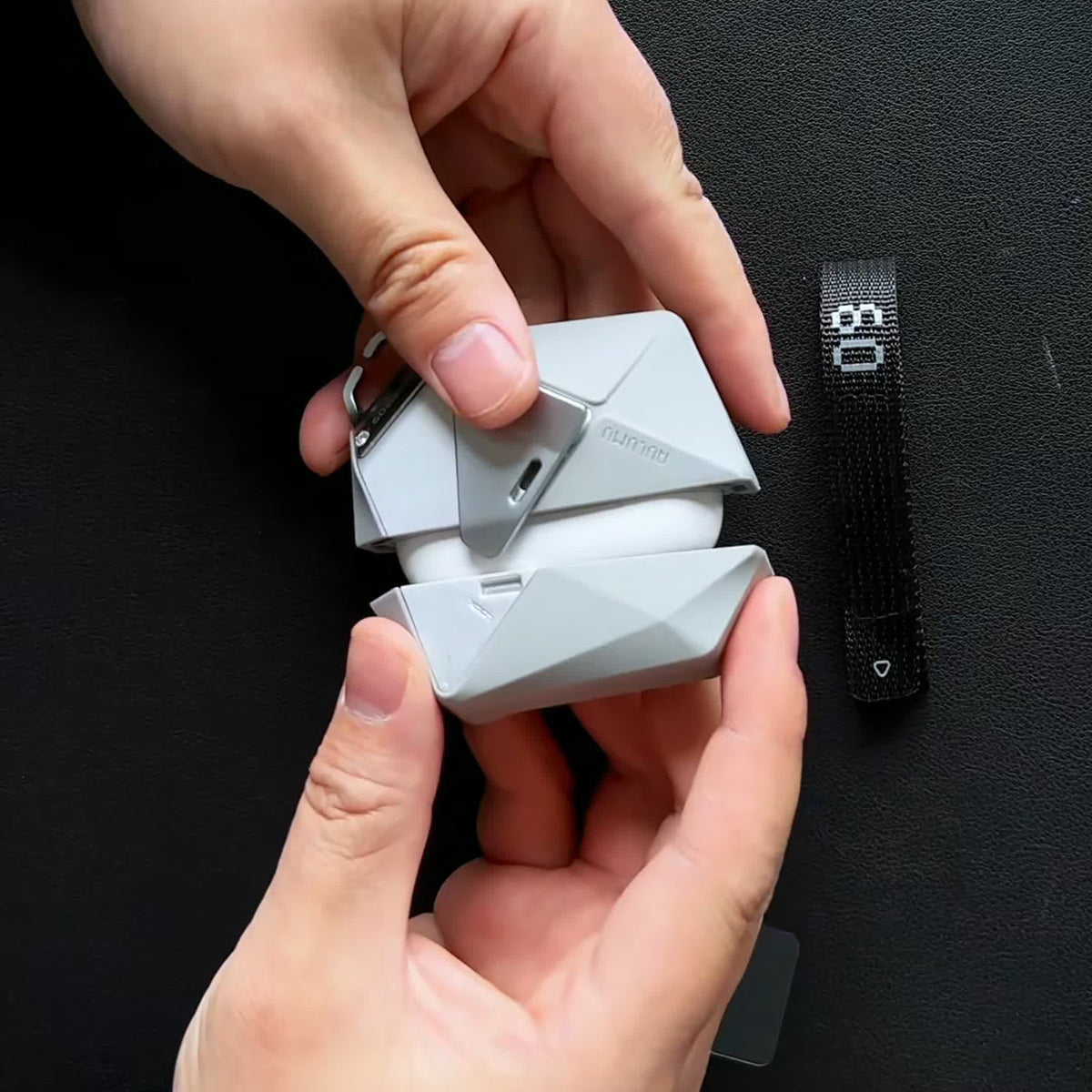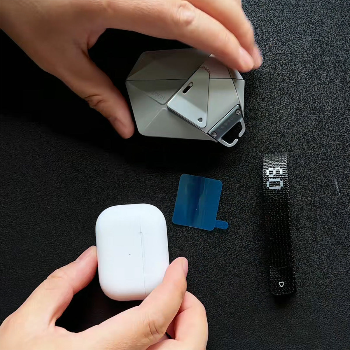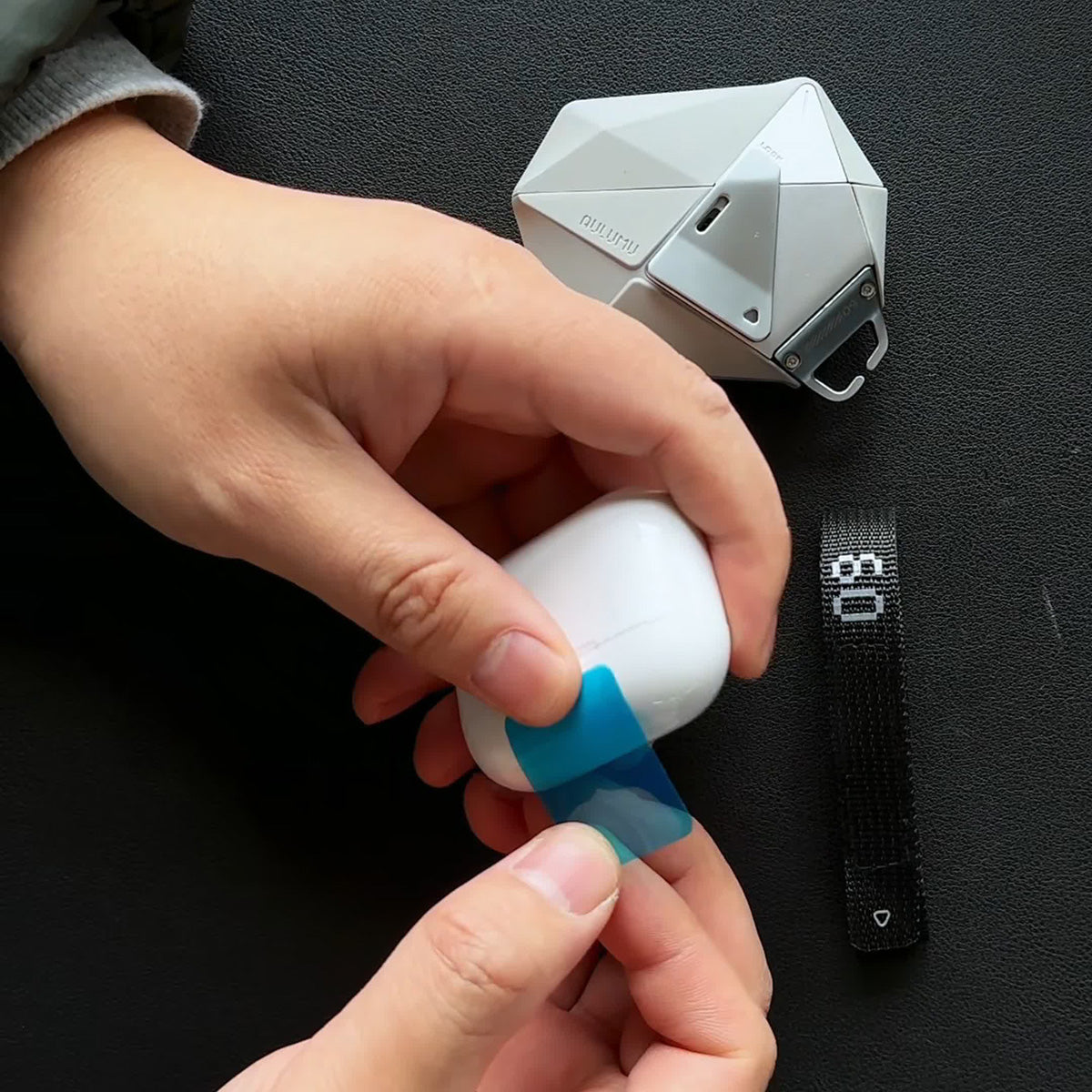 Prepare all the parts, AirPods Pro, top cover, bottom cover, traceless adhesive sticker and lanyard.