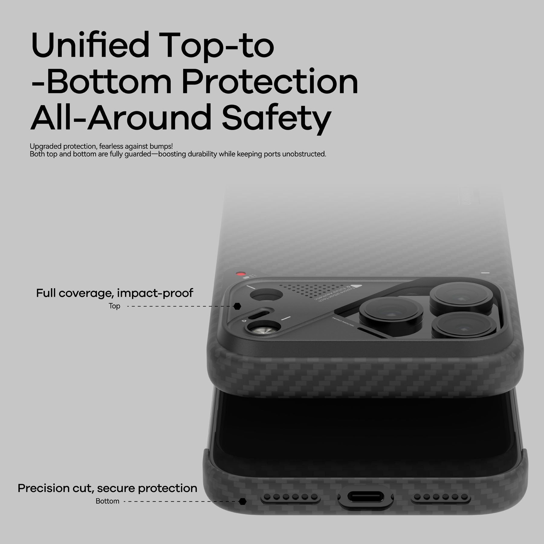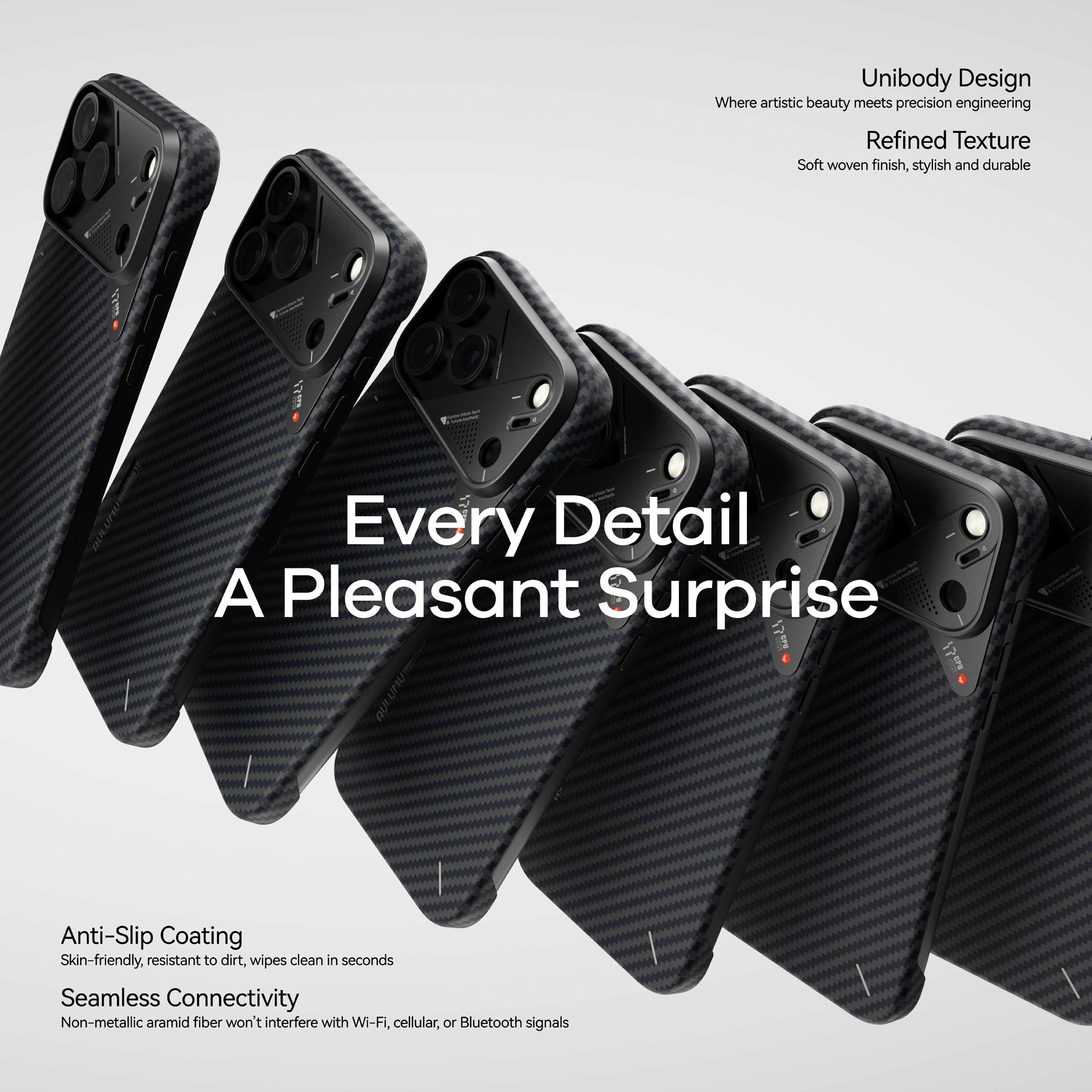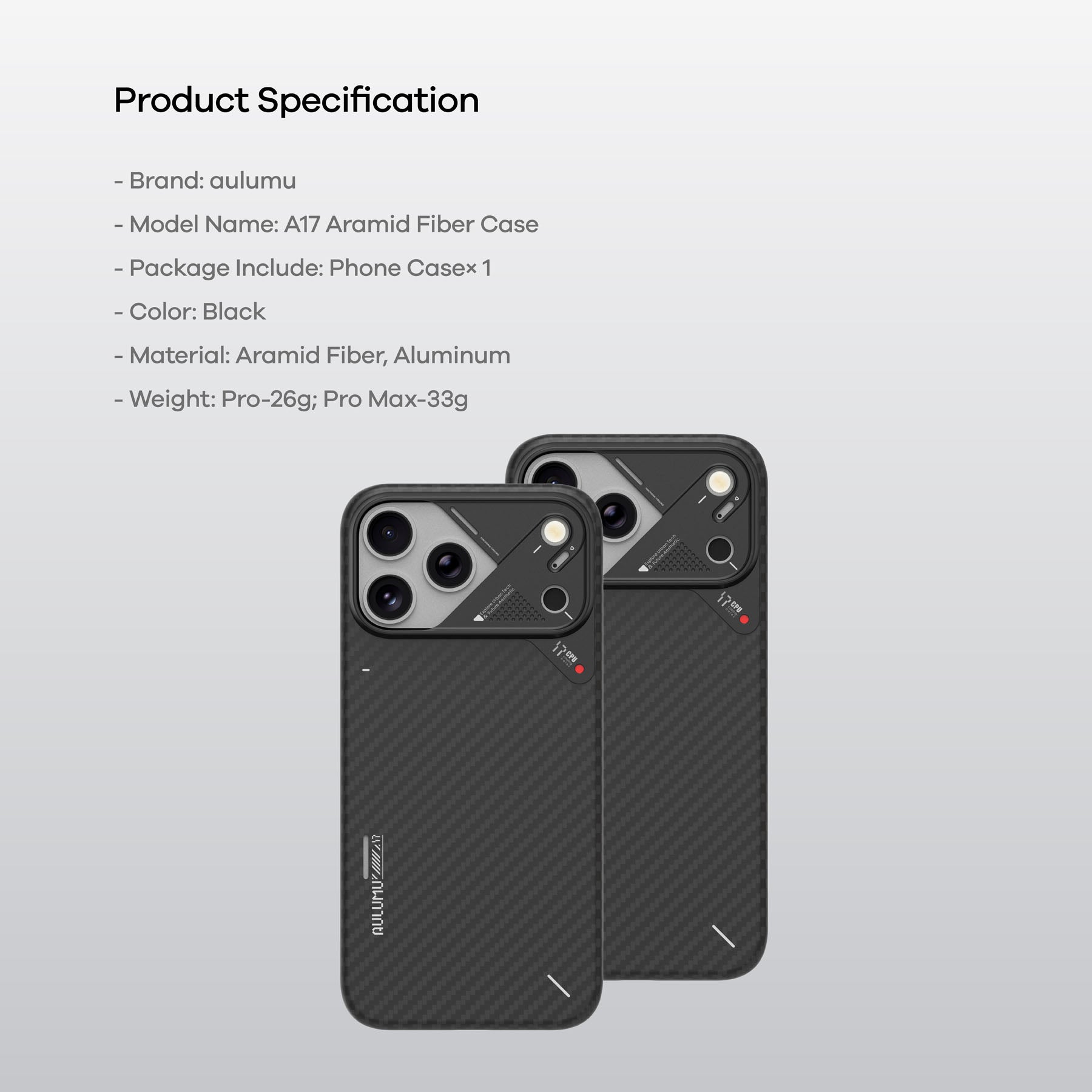 Building on the sleek design of our classic aramid fiber cases, the A17 Case brings ultra-thin, ultra-light protection to the iPhone 17 Series. Crafted from premium aramid fiber with an upgraded aluminum camera frame, it combines timeless durability with modern enhancements for smarter everyday use. Compatible with MagSafe and designed for a secure, comfortable grip, the A17 elevates both style and functionality for iPhone 17 Pro, 17 Pro Max and Air.