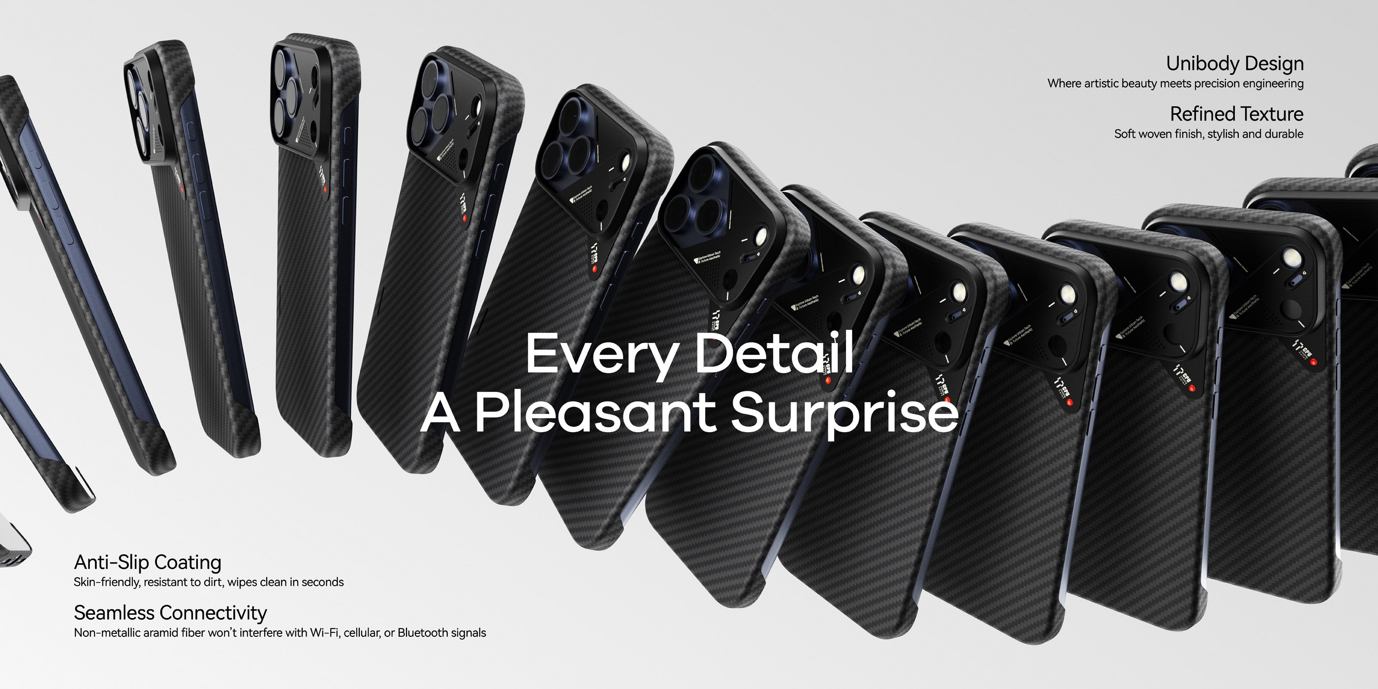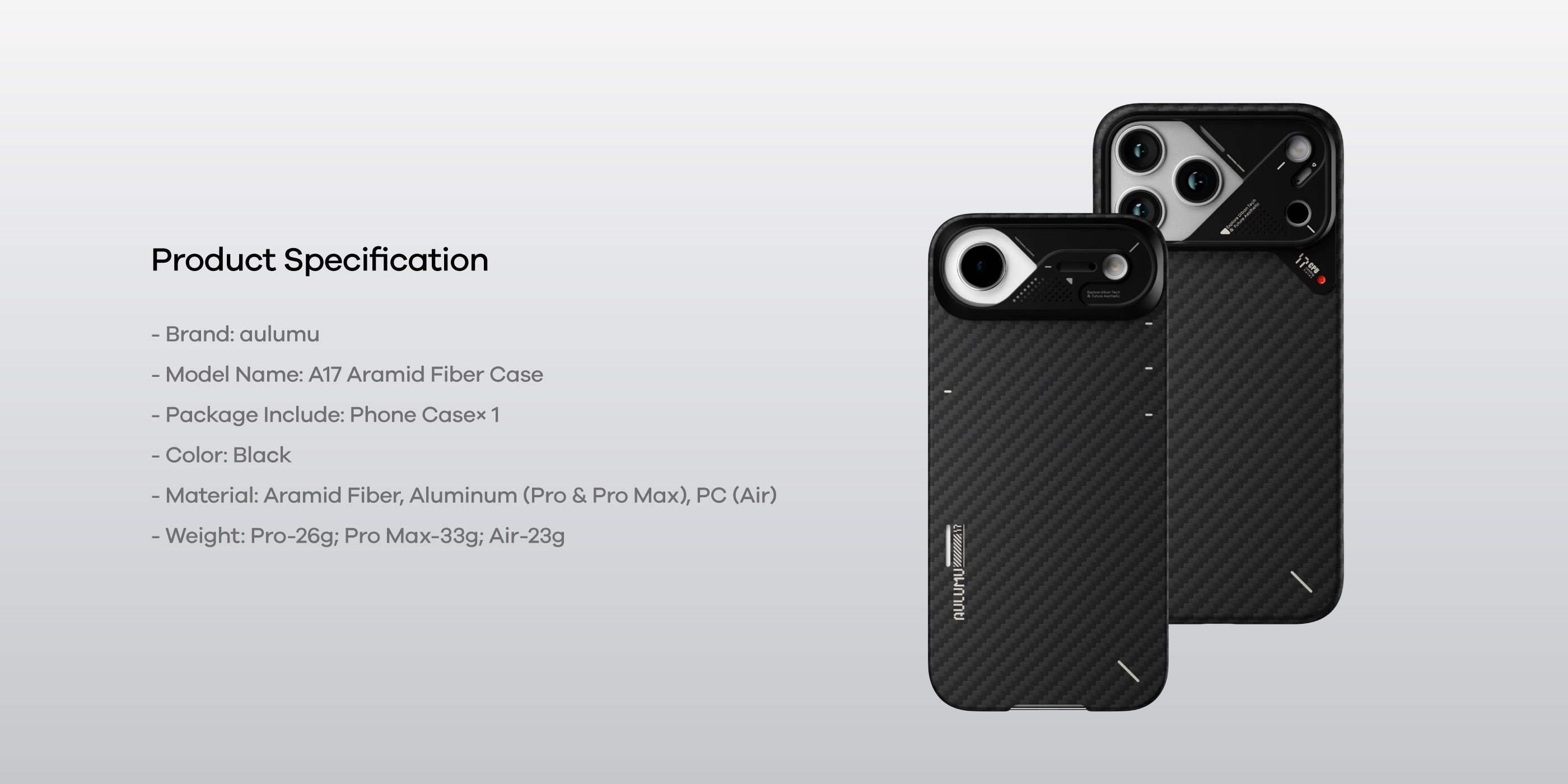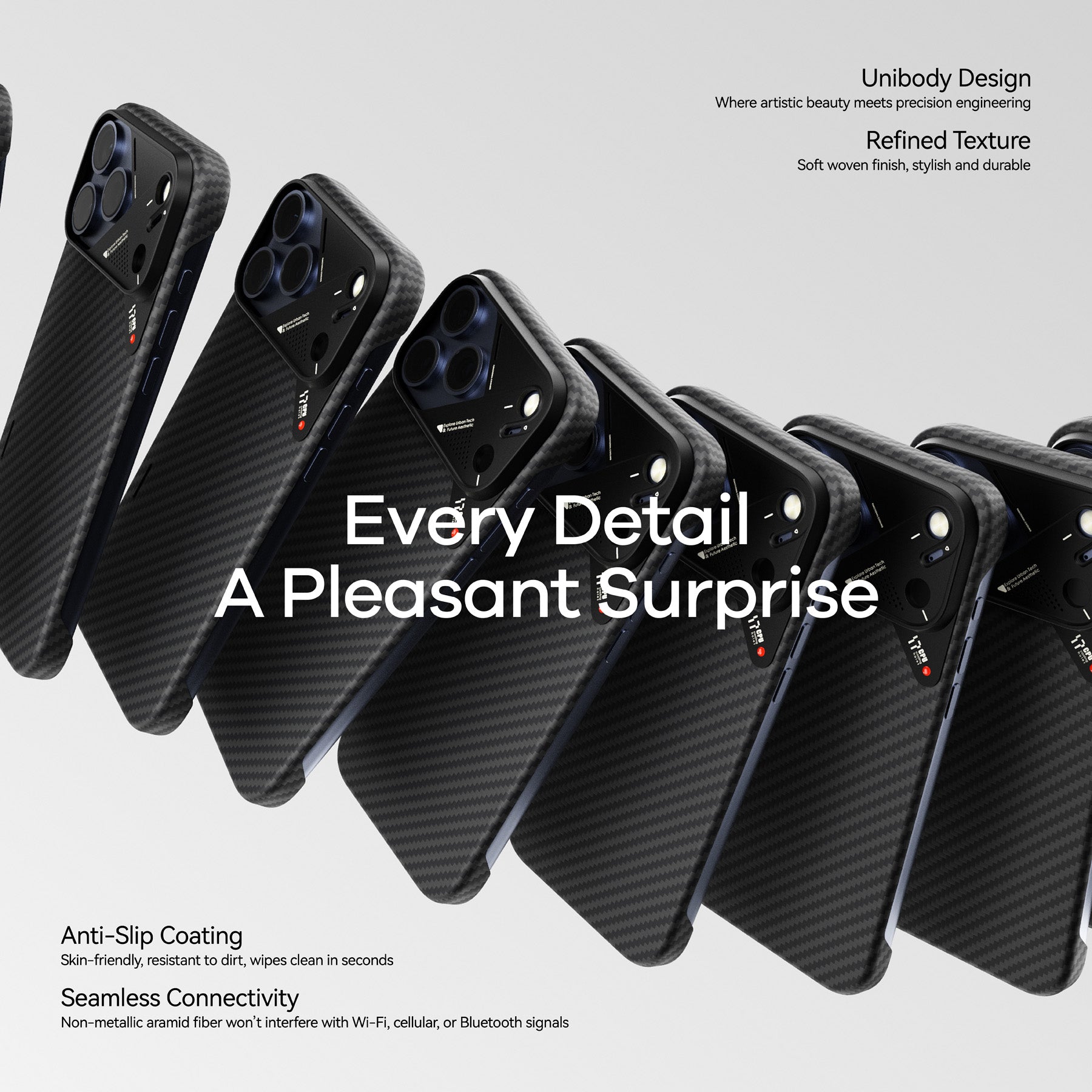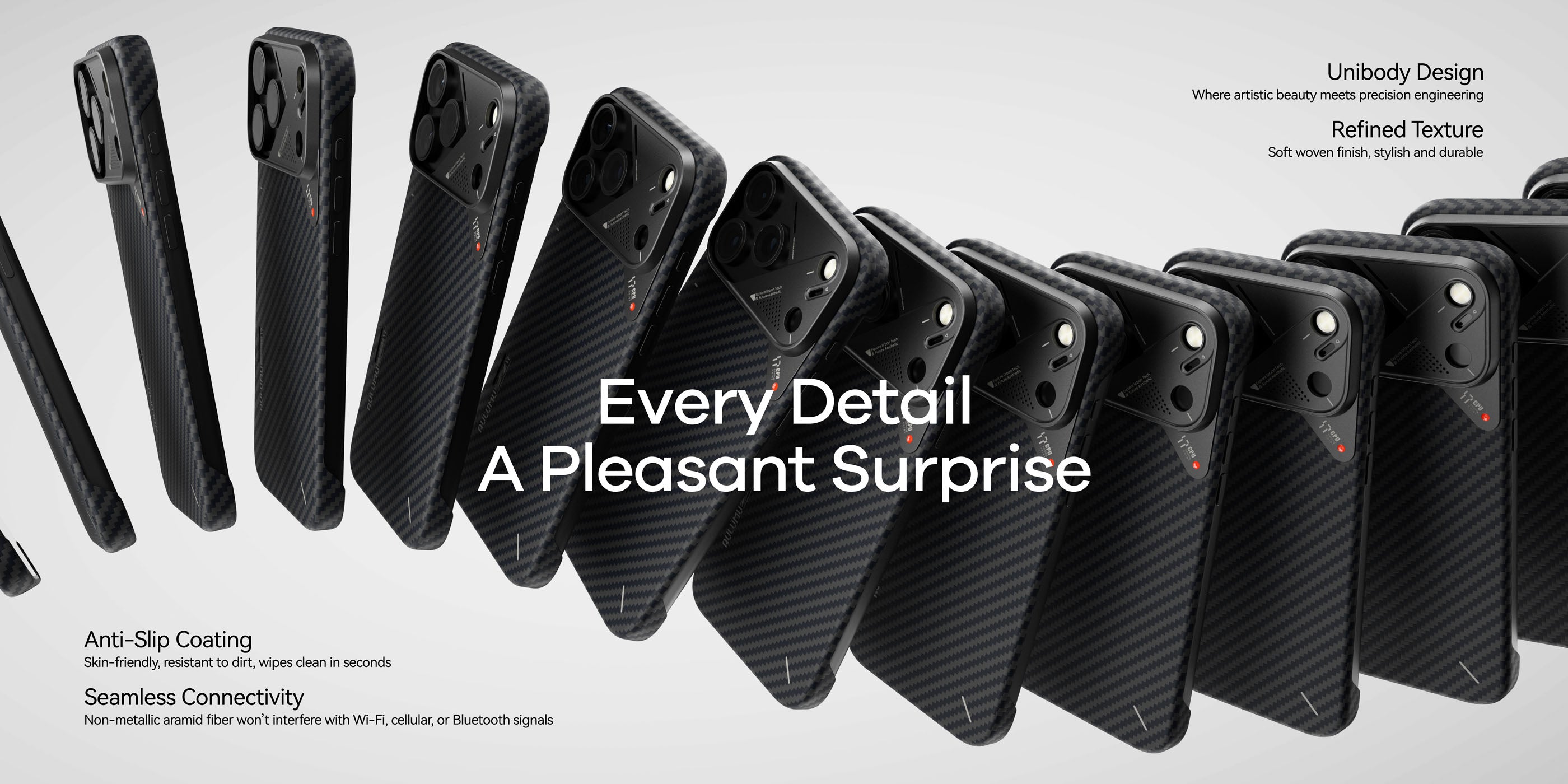 Building on the sleek design of our classic aramid fiber cases, the A17 Case brings ultra-thin, ultra-light protection to the iPhone 17 Series. Crafted from premium aramid fiber with an upgraded aluminum camera frame, it combines timeless durability with modern enhancements for smarter everyday use. Compatible with MagSafe and designed for a secure, comfortable grip, the A17 elevates both style and functionality for iPhone 17 Pro, 17 Pro Max and Air.