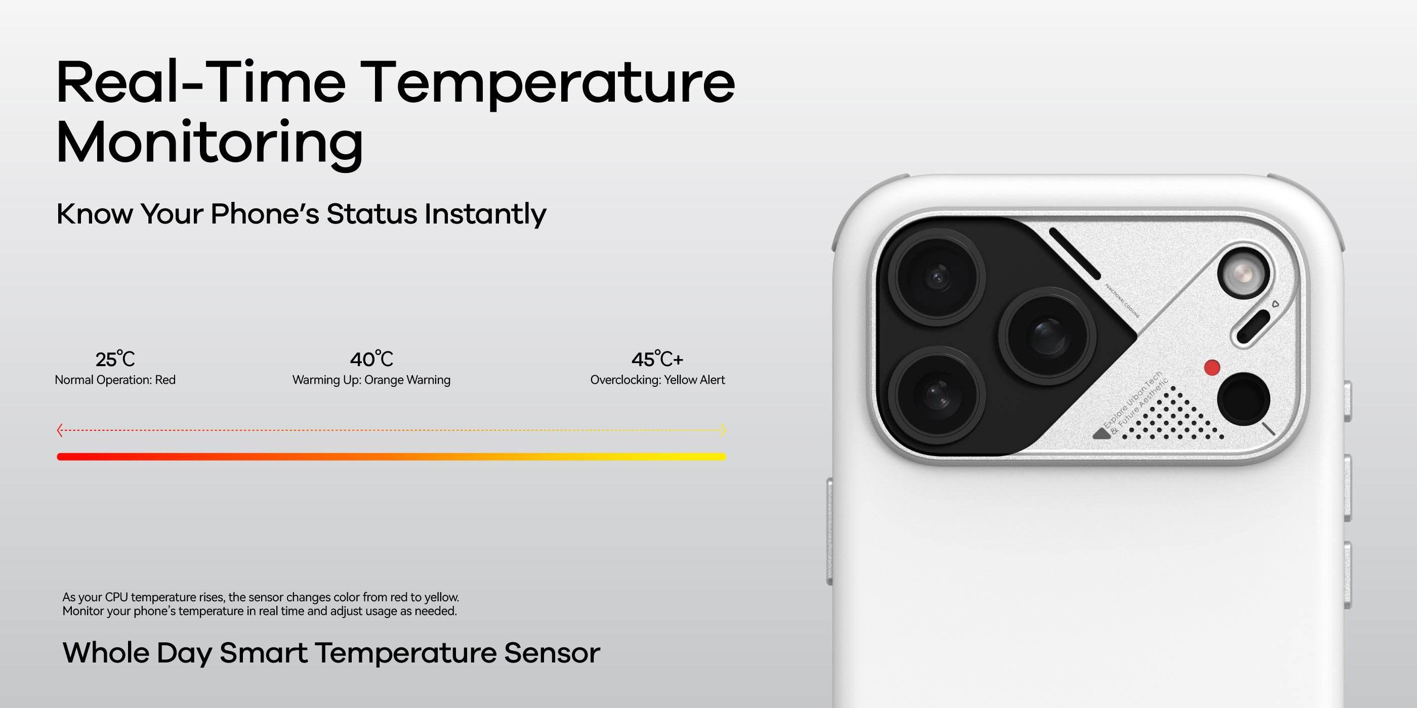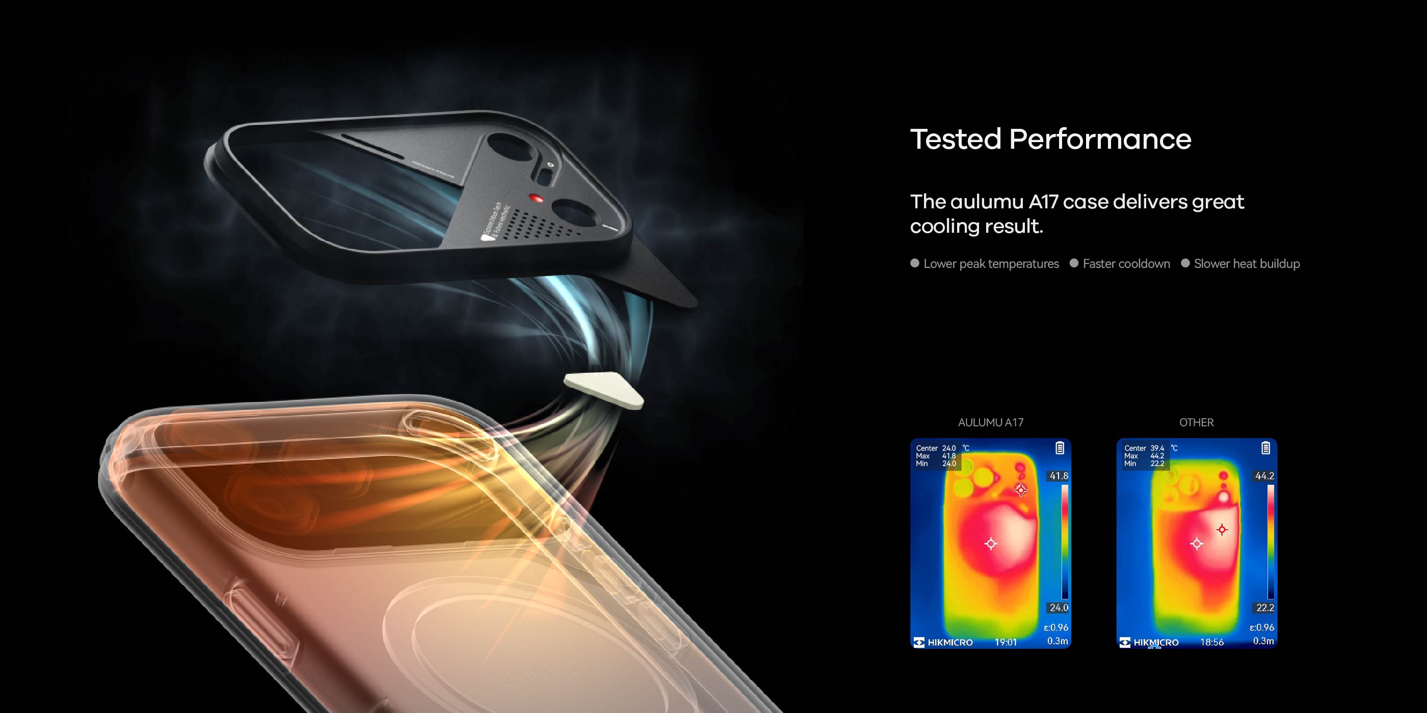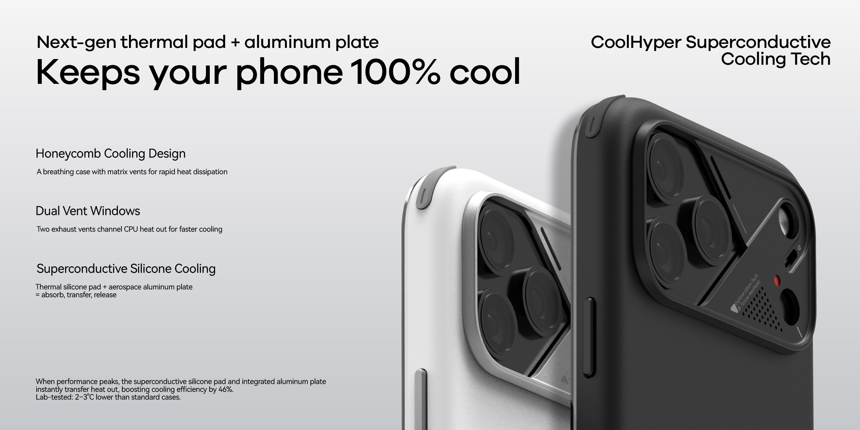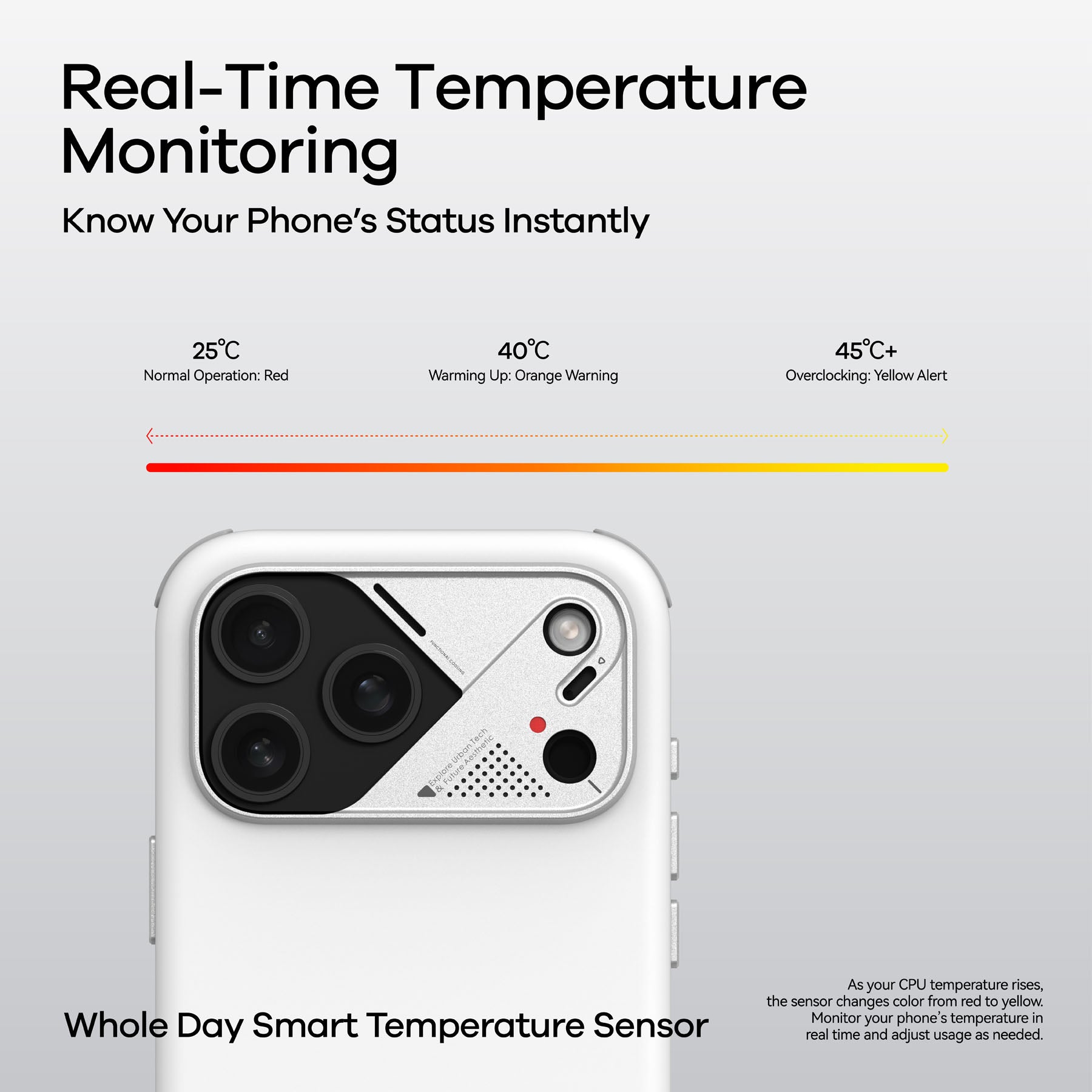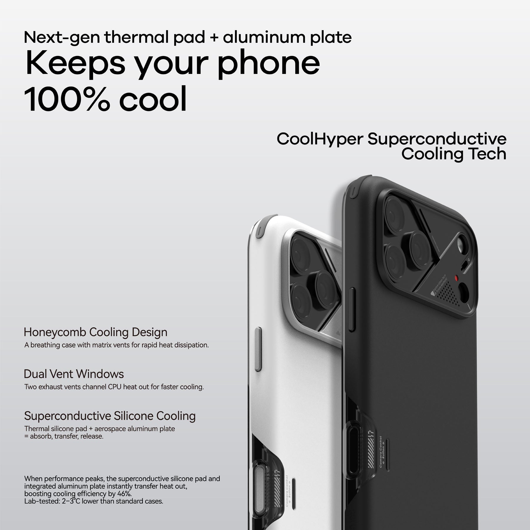 The superconductive silicone pad and integrated aluminum plate boost cooling by 46%, while the color-changing temp indicator keeps you informed. Stylish, durable, and portable — the perfect balance of protection, cooling, and design.