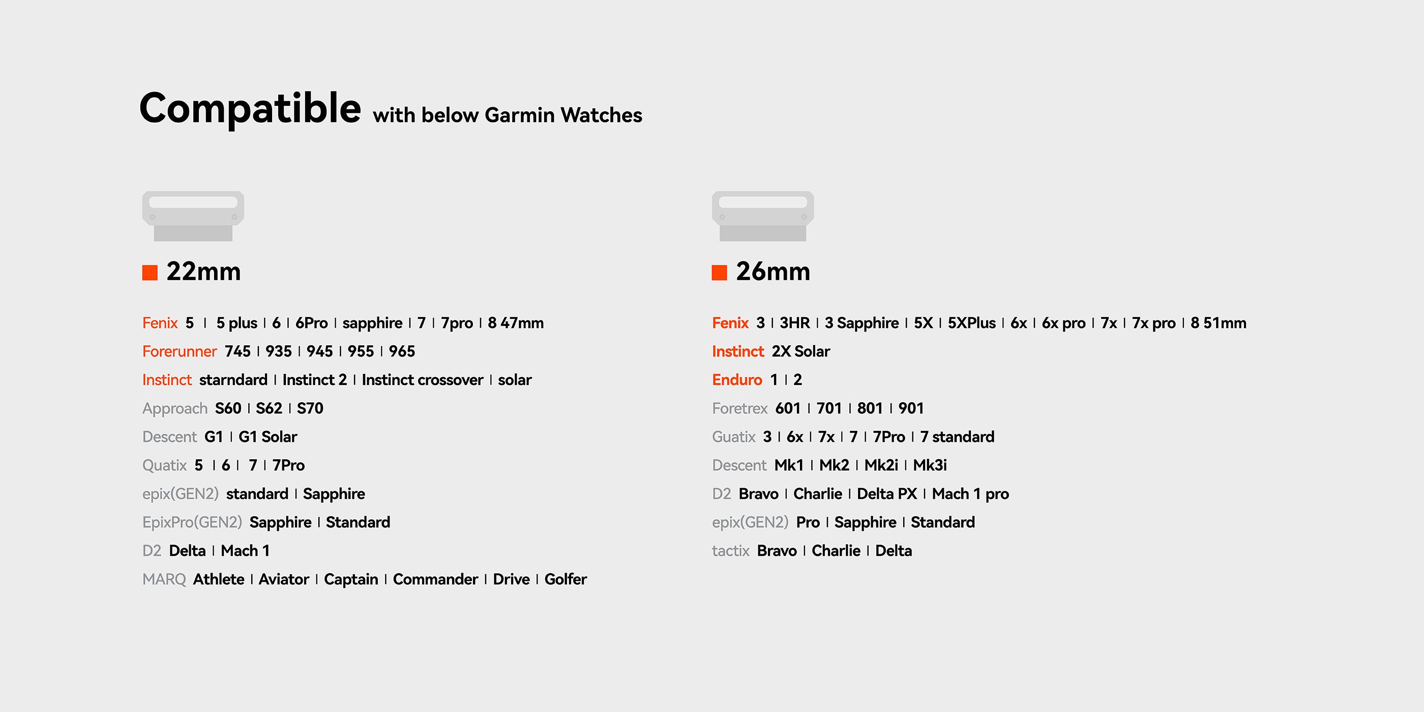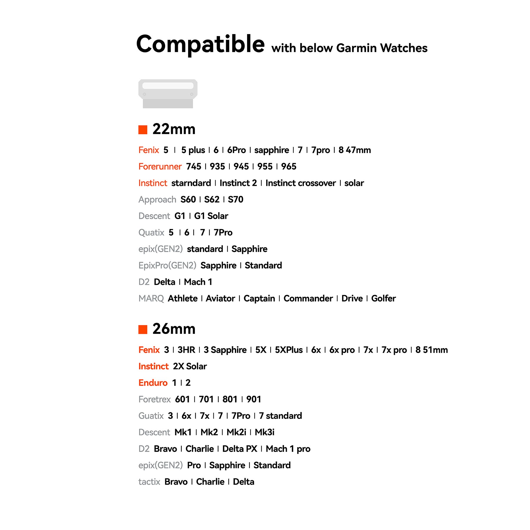 Garmin watch with 22mm &26mm Quickfit connector. Including Fenix, Instinct, Forerunner and more.